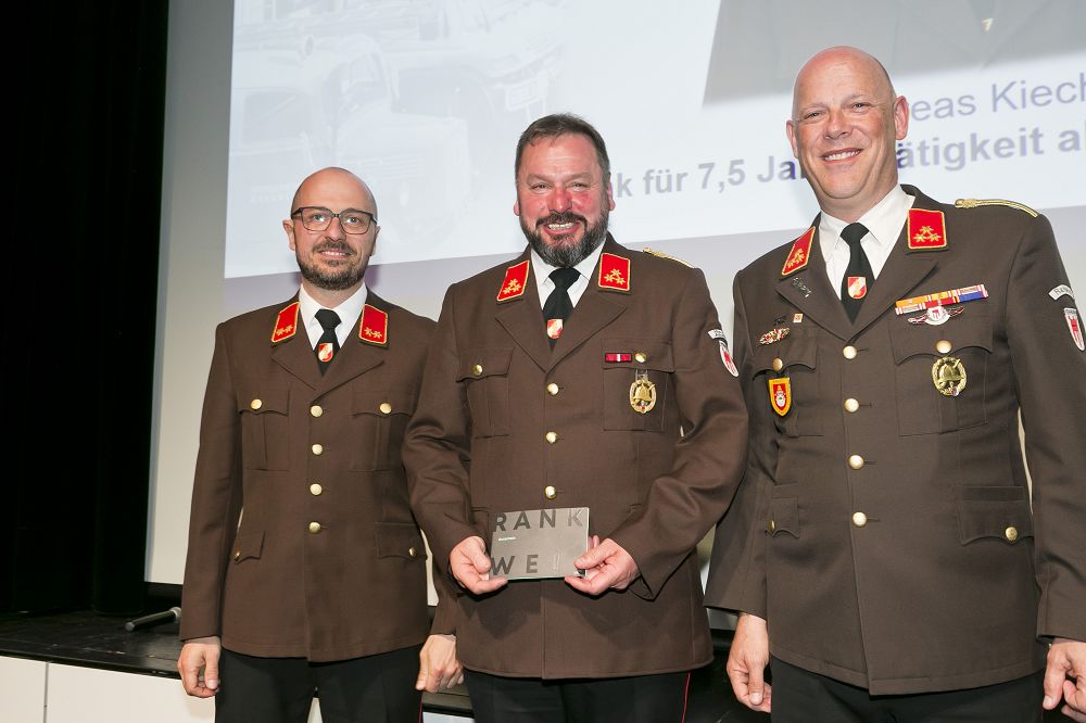 Nach den Angelobungen bedankte sich Kommandant Markus Mayr bei Andreas Kiechle, welcher im vergangenen Berichtsjahr die Funktion des Fahrzeugwartes für das Löschfahrzeug nach mehrjähriger Ausübung zurückgelegt hatte. Ebenfalls wurde jenen Kameraden-/innen mit einem Präsent gedankt, welche an über 80% der Ausbildungseinheiten im Jahr 2025 teilgenommen haben.
