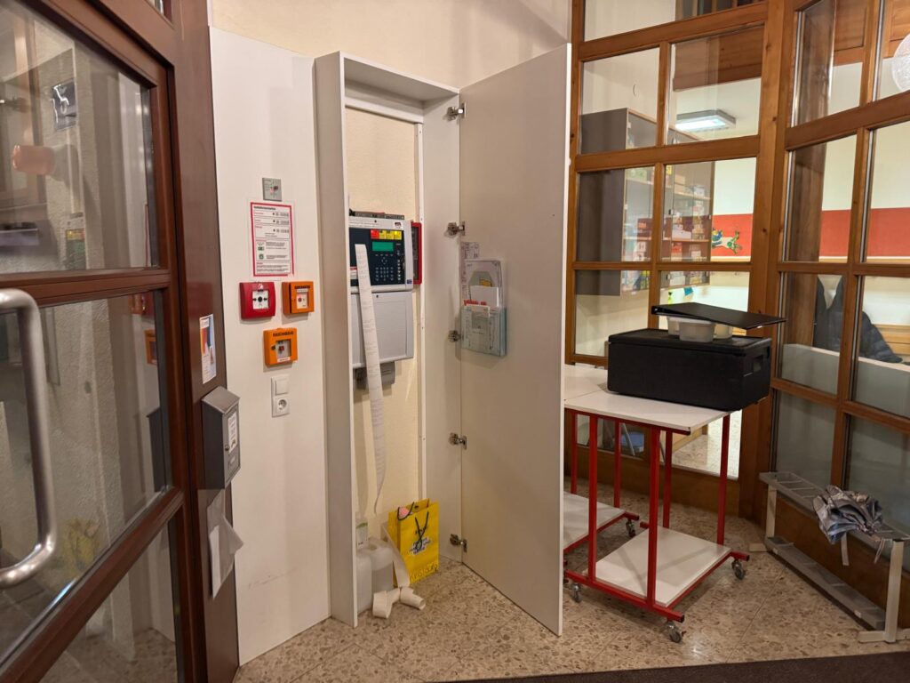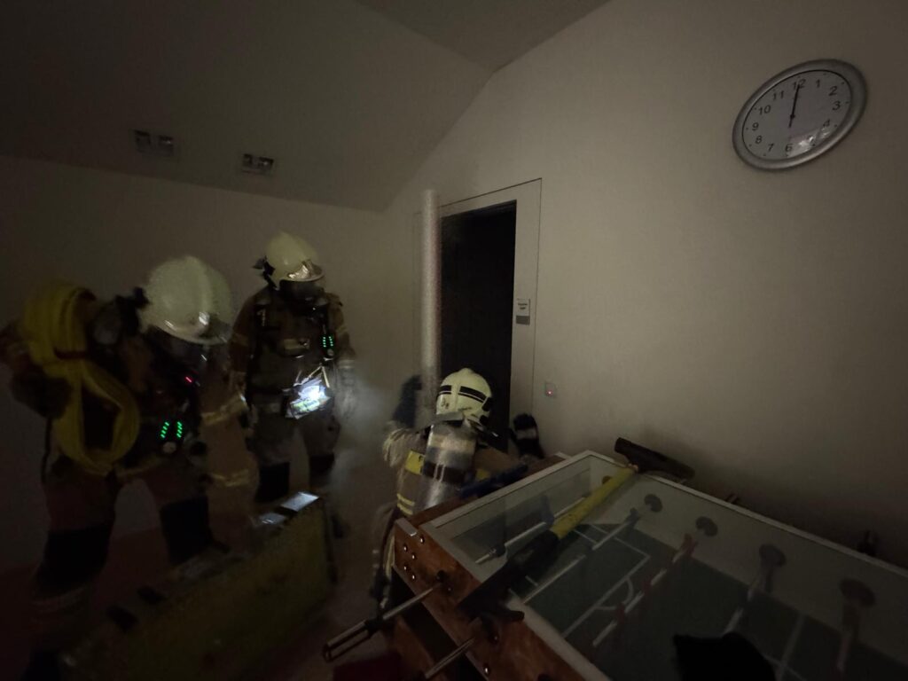 Parallel dazu wurde der Innenangriff vorbereitet und durchgeführt. Zudem bot die Übung eine gute Gelegenheit, den Umgang mit der Brandmeldeanlage sowie die damit verbundenen Abläufe für die Führungskräfte praxisnah zu festigen.
