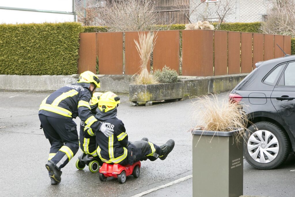 Erstes Ziel war das Gasthaus Mohren. Um die Mitarbeiter aus der sicheren Küchenstellung zu locken, wurde vor dem Gebäude ein dramatisches – selbstverständlich streng geheimes – Bobbycar-Rennen veranstaltet.