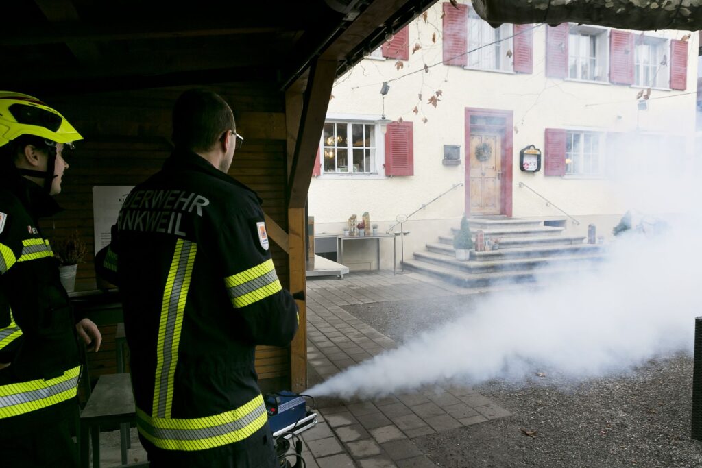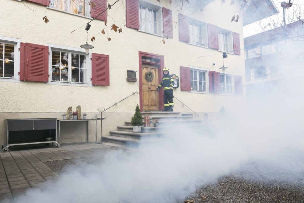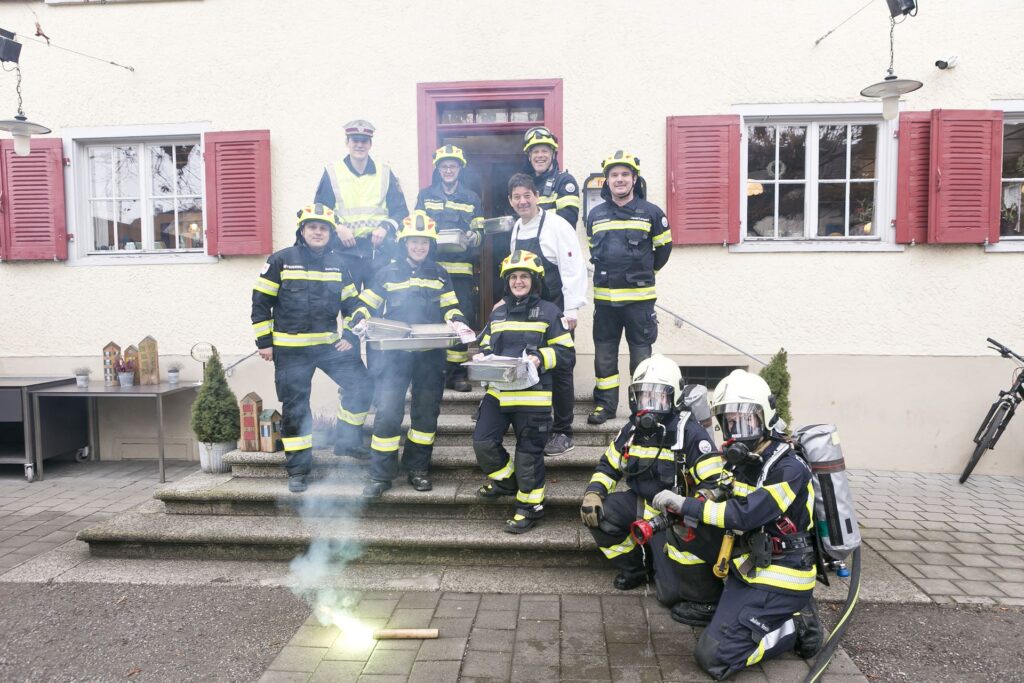 Im Gastgarten wurde mittels Rauchkanone und bengalischem Feuer ein eindrucksvolles Brandszenario simuliert. Dichte Rauchschwaden stiegen auf, Blaulicht flackerte, Funkgeräte knisterten – und ein Atemschutztrupp rückte unter schwerem Gerät zur „Brandbekämpfung“ vor.