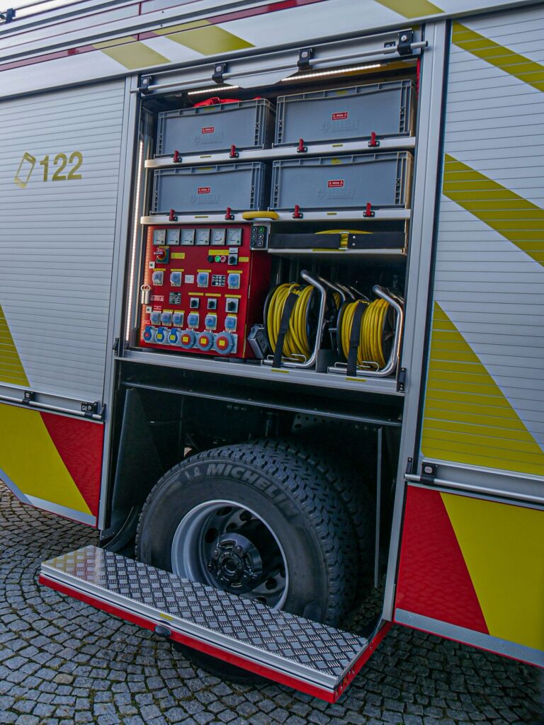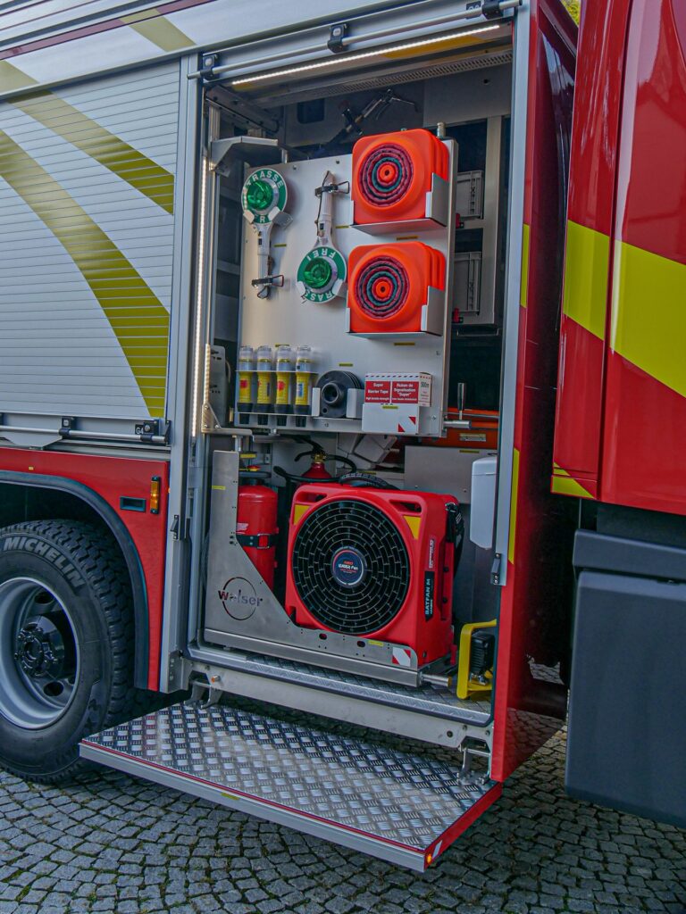 Das Löschfahrzeug wird mit einer Besatzung von neun Einsatzkräften besetzt, wobei in der Mannschaftskabine fünf Atemschutzgeräte vorhanden sind, damit sich die Atemschutzträger schon während der Anfahrt ausrüsten können.